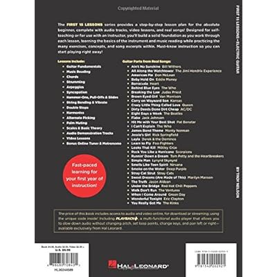 (Guitar Educational). The First 15 Lessons series provides a step-by-step lesson plan for the absolute beginner, complete with audio tracks, video lessons, and real songs! Designed for self-teaching or for use with an instructor, you'll build a solid foundation as you work through each lesson, learning the basics of the instrument and music reading while practicing the many exercises, concepts and song excerpts within. Must-know instruction so you can start playing right away, with a free online tuner and metronome! The electric guitar book features lessons on: guitar fundamentals, music reading, chords, strumming, arpeggios, syncopation, hammer-ons & pull-offs, slides, string bending & vibrato, double stops, harmonics, alternate picking, palm muting and scales & basic theory. Includes guitar parts from 33 songs: American Pie * Brown Eyed Girl * Crazy Little Thing Called Love * Hit Me with Your Best Shot * James Bond Theme * Layla * Runnin' down a Dream * Smells like Teen Spirit * Smoke on the Water * Under the Bridge * When I Come Around * You Really Got Me * and more. Fast-paced learning for your first year of instruction!